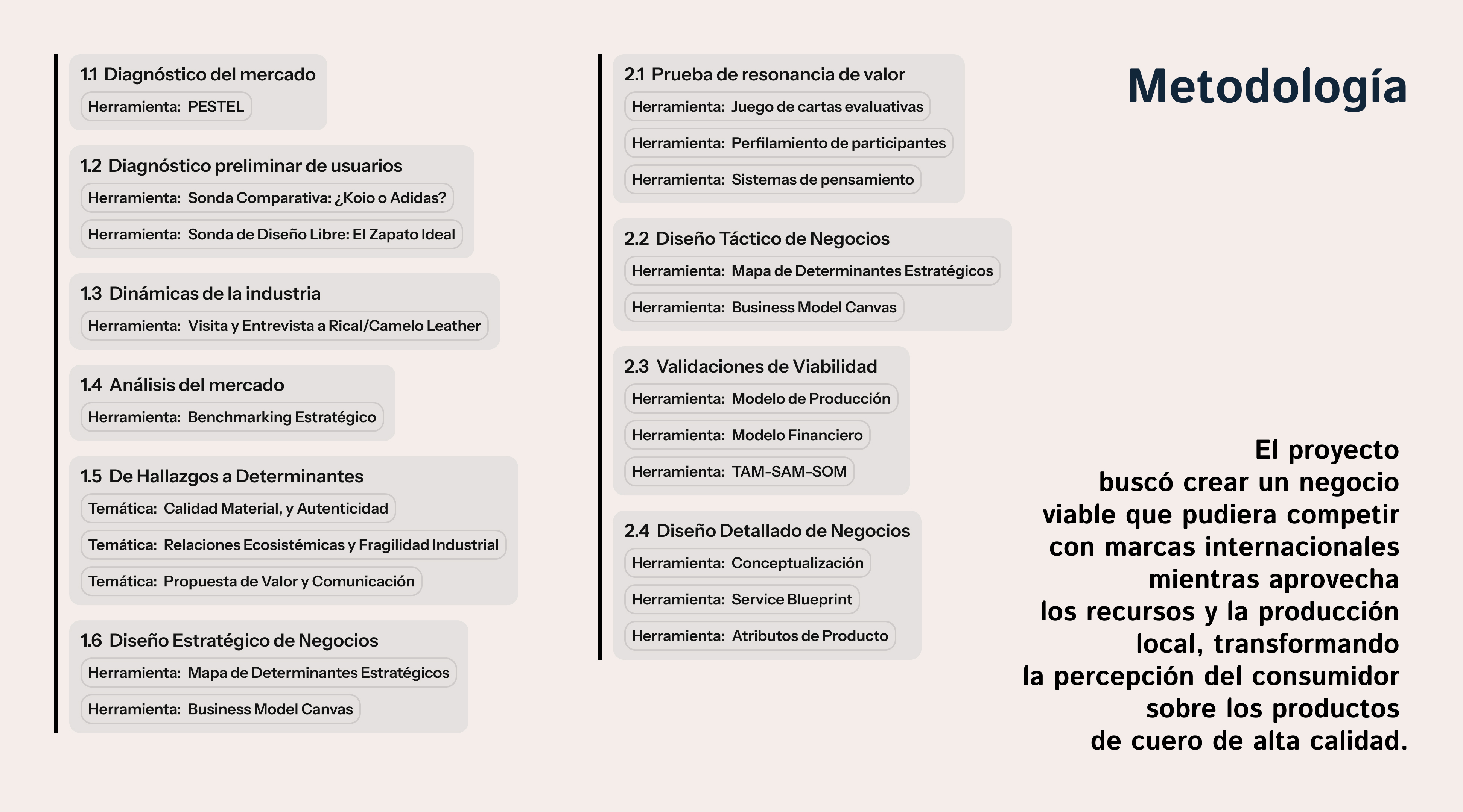 En este proyecto, realicé un análisis exhaustivo del mercado de calzado premium en Colombia, que resulta en diseño de negocio para una marca de zapatos de cuero de alta gama. El análisis incluyó un benchmarking estratégico de más de 20 marcas nacionales e internacionales, sondas con un público juvenil diverso, entrevistas con expertos, un detallado estudio de costos que reveló un punto de equilibrio de 23 pares vendidos al mes, y la validación del modelo de negocio a través de pruebas con usuarios. El proyecto buscó crear un negocio viable que pudiera competir con marcas internacionales mientras aprovecha los recursos y la producción local, transformando la percepción del consumidor sobre los productos de cuero de alta calidad.